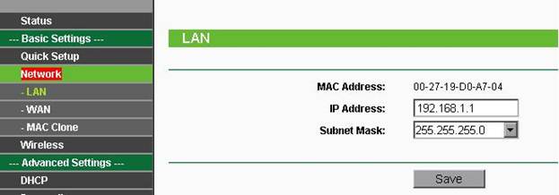 Шаг 3.Заходим во вкладку Network-->LAN и по желанию меняем IP адрес маршрутизатора, обычно меняют последние две цифры. Это делается в целях безопасности и защиты вашей сети. Cохраняем Save.