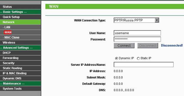 Если же это Static IP, PPoE, PPTP,L2TP и др., то прописываются данные, которые должен предоставить провайдер: User Name, Password, Server IP Address/Name, IP Address, Subnet Mask, Default Gateway, DNS... Cохраняем Save, продолжаем настройку.