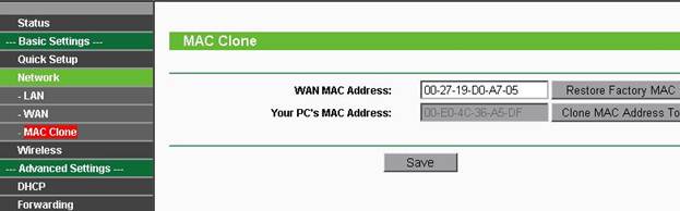 Шаг 5. Затем открываем вкладку MAC Clone. Требуется не во всех случаях, и зависит от провайдера,а также если маршрутизатор ставится после кабельного или ADSL модема. Нажимаем Clone MAC Address и сохраняем Save.