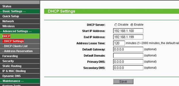 В строке Start IP Address меняем последние две цифры, если вы их меняли в начале. Например: вы изменили IP адрес маршрутизатора на 192.168.2.3, прописываем 192.168.2.300, а в строке End IP Address – 192.168.2.399. Это означает, что роутер назначит первому ПК адрес 192.168.2.300, второму 192.168.2.301, третьему 192.168.2.302 и так далее. В случае если IP адрес роутера не меняли, то всё оставляем по умолчанию! Сохраняем Save.