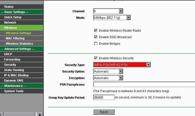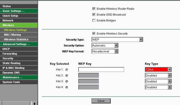 Wireless Settings, двигаемся ниже и ставим галочку Enable Wireless Security, выбираем в строке Security Type тип шифрования WEP, WPA/ WPA2, WPA-PSK/ WPA2-PSK (зависит от адаптера вашего ПК ). Строки Security Option/ WEP Key Format оставляем по умолчанию.