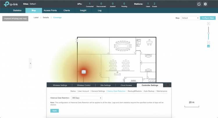 Существует 2 способа получения доступа к контроллеру – web и приложение (Android и iOS). Большинство вкладок в web демонстрируют статистические данные и различную информацию о ТД, подсоединенных клиентах, логии и так далее. Особенно понравилось то, что можно загрузить схему самого помещения и разработать наиболее эффективную карту расположения точек доступа с отображением теоретической мощности сигнала и зоны покрытия каждой ТД.
