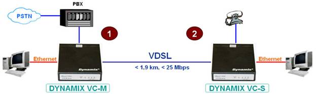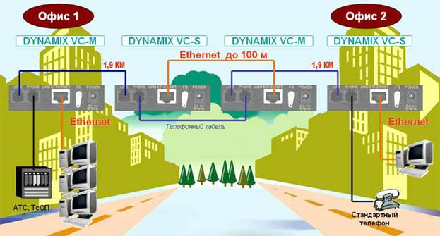 7. Соответственно, сеть второго офиса подключается к разъему VDSL модема DYNAMIX VC- S с маркировкой "Ethernet" Телефоны функционируют одновременно с передачей данных, рабочее расстояние удвоилось.