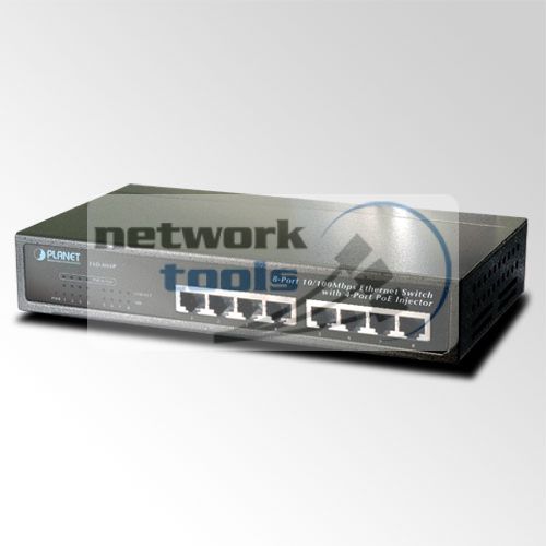 PLANET FSD-804P - недорогий високопродуктивний комутатор з 8 портами 10/100 Fast Ethernet, 4 з яких є джерелами живлення (power injector) для 4 пристроїв PoE (стандарту IEEE802.3af).