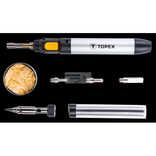 Паяльник газовий TOPEX 4,40E+109, мікропальник, 4 насадки, об'єм ємності для газу 12 мл, 400°C, регулювання полум'я, блокування кнопки