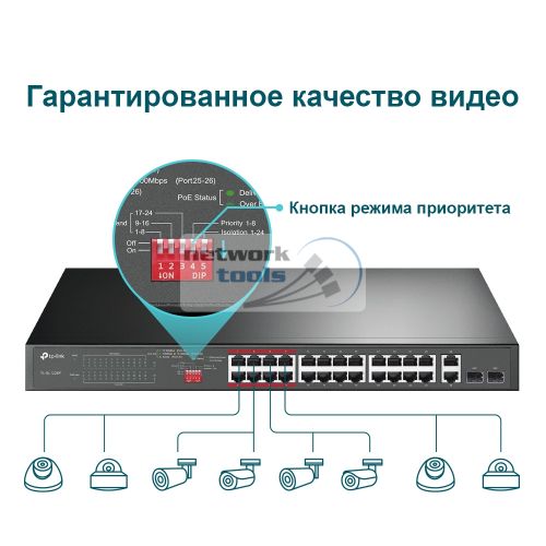 Оскільки світильник відповідає параметрам PoE+ 802.3af.at, кожен слот підтримує до 30 Вт. Сумарний бюджет для всіх 24 роз'ємів PoE – 250 Вт. Це дає великий функціонал – облаштування відеоспостереження в офісних комплексах, на виставкових майданчиках, гуртожитках. TL-SL1226P поєднується з IP-камерами та телефонами, роутерами, десктопами, апаратурою для друку. Плавність відеопотоку дає пару гігабітних слотів RJ45 та пара комбо SFP. При цьому відразу можуть нормально функціонувати 24 HD IP-камери.