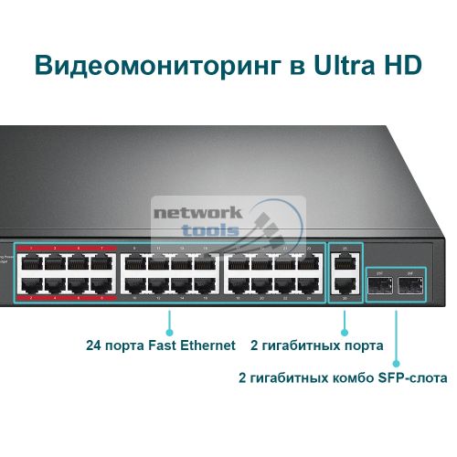- Інтерфейси 24 порти RJ45 PoE+ 10/100 Мбіт/с, 2 гігабітні комбо RJ45/SFP-слота